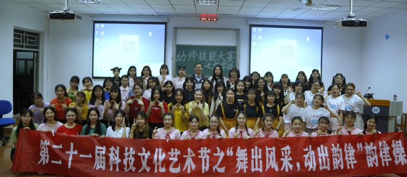 为积极响应我校举办的第二十一届科学文化艺术节,丰富学生课余生活,拓展学生职业技能,由共青团惠州学院团委会和惠州学院学生会主办,教育科学学院学生会承办的幼师技能大赛之韵律操比赛于
