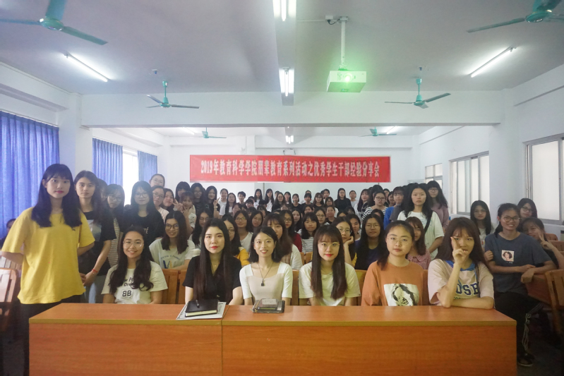 为发挥朋辈教育在学生中的榜样作用,营造积极向上的学习氛围,拓展学生第二课堂,教育科学学院于2019527日上午830,在旭日楼206举办2019年朋辈教育系列讲座第一场——优秀学生干部经验分享会。本次讲座由辅导员唐慧琴主持,邀请2017-2018学年国家奖学金获得者15级学前教育1班黄妍主讲, 参与本次分享会的为学院全体学生干部。