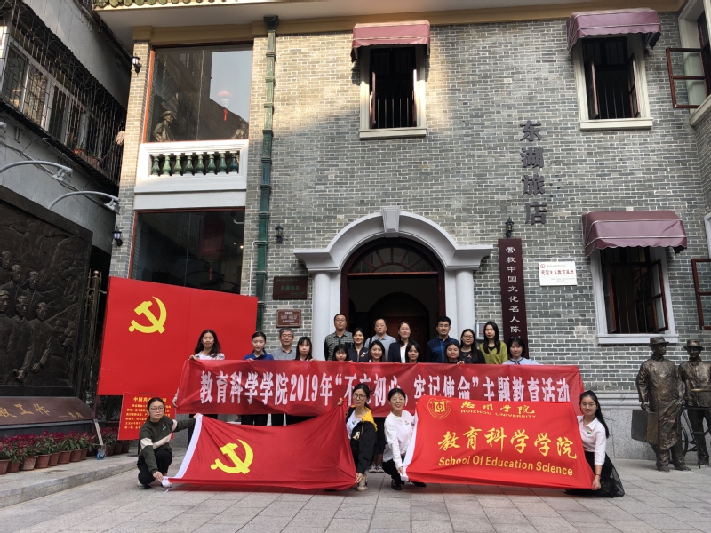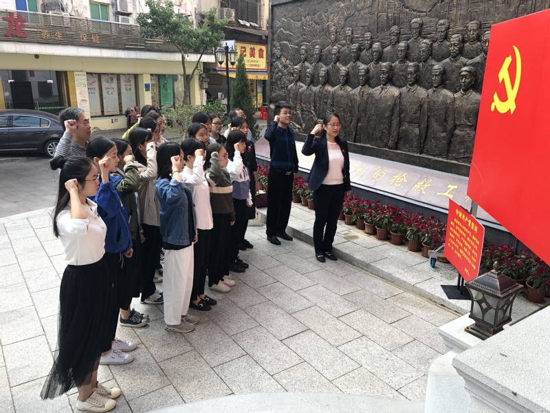 在营救中国文化名人陈列馆(东湖旅店)。教工支部书记谢桂新带领全体党员重温入党誓词。