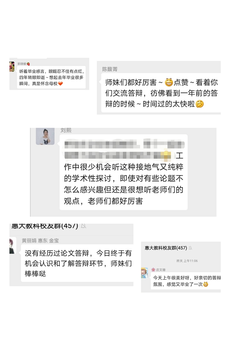 旁听的许多校友反响良好,如2017届庄文珊校友表示对此次直播会议效果感到满意,“今天上午很美好呀,好亲切的答辩氛围,感觉又毕业了一次。”另一位2017届校友刘熙感慨:“工作中很少机会听这种接地气又纯粹的学术性探讨,即使对有些论题不感兴趣,还是很想听老师们的观点,老师们都好厉害。”