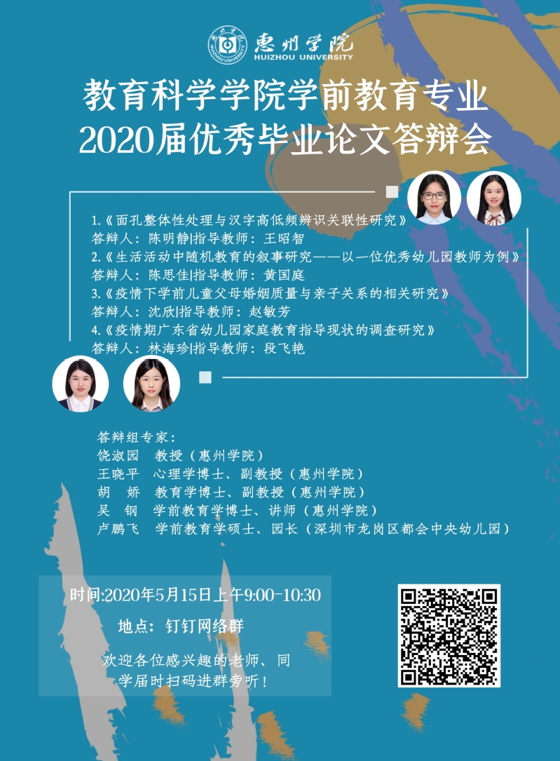 基于疫情这一现状,教科院于2020515日上午举行了学前教育专业2020届优秀毕业论文线上答辩会。此次答辩会的专家组由我院的饶淑园教授、王晓平副教授、胡娇副教授、吴钢博士,以及来自深圳市龙岗区都会中央幼儿园的卢鹏飞园长组成。答辩会对外开放,吸引了本学院的教师、学生,甚至众多已经毕业校友进群旁听,人数多达185人。