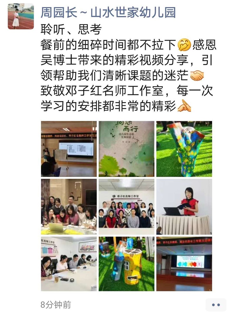 活动中,名师工作室老师从研究目标、研究内容、研究进展和研究存在问题等方面汇报了各自幼儿园园本课程发展现状。汇报完后,