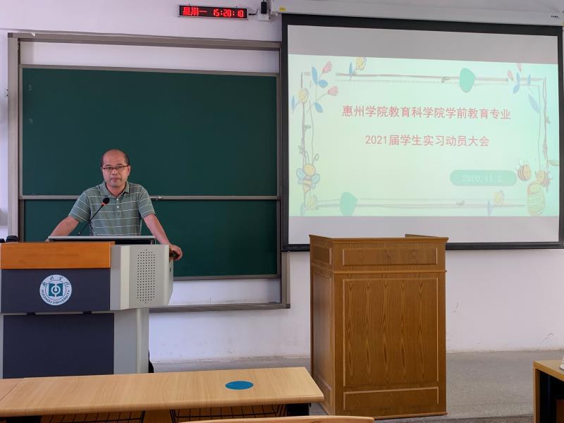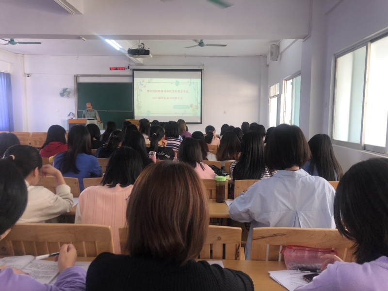 第二项议程由黄国庭主任讲解实习具体工作计划。黄主任就实习目的从两方面展开:一方面,实习对于学生自身而言是一次在实践中检验、巩固、提高、丰富所学理论和技能的机会,同学们应当学习、掌握保教能力,为毕业参加工作奠定基础;另一方面,教育实习对于学院而言,有助于维护已有实习基地,保障我院实习工作的后续发展。黄主任接着详细地讲解了本次实习的具体时段、形式以及各实习指导老师的职责,同时他也根据自己对各个幼儿园接纳实习生情况的了解,鼓励同学们好好表现,对在座学生寄予厚望。