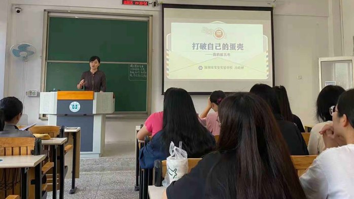 老师首先以李嘉诚的“鸡蛋理论”作为引子,进而指出学会教学的过程就是一次次打破自己蛋壳的过程。从学的角度出发,冯老师强调教学能力的提升,需要向经验学、向同伴学、勇于挑战、勇于尝试、乐于分享。随后从“不同角色教师的日常生活是怎样的?”“见习、实习经历中什么事情最重要?”“第一年的我是怎样度过的?”“如何学会教学”四个方面分享了自己如何在五年中迅速提升自己的数学教学能力。最后,建议同学们通过参与活动,拓宽广度;通过教学比赛,提高速度;通过课题研究,挖掘深度;通过日常阅读,积累厚度。