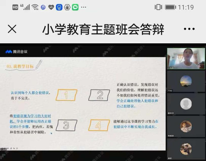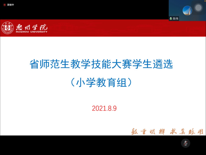 近日,教育科学学院小学教育专业组织完成了广东省教学技能大赛的第一轮遴选,初步从各班推荐的11名参赛选手中遴选出6名选手。8月9日上午,教科院在腾讯会议平台举行了第二轮遴选活动。本场遴选以主题班会说课和答辩为主要内容,根据选手的综合表现遴选出最终参加省赛的4名选手。活动由小学教育系主任陈国钦主持,活动评委由下角小学梁小敏副校长、合生实验学校陈萍主任,教育科学学院马秀春博士、王贤文博士、胡娇博士担任,学院陈伟院长、谢桂新副院长以及小学教育、学前教育专业师生在线观赛。