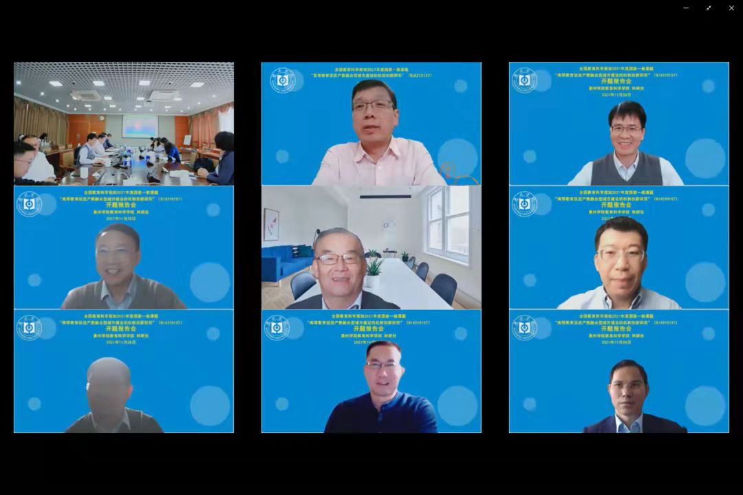 2021年11月28日上午,教育科学学院院长陈伟教授主持的全国教育科学规划2021年度一般课题“高等教育促进产教融合型城市建设的机制创新研究”(课题批准号:BIA210157),在惠州学院行政楼501会议室,以线上线下相结合的方式,举行了开题报告会。与会的评议专家有北京师范大学周海涛教授、华南师范大学卢晓中教授、中国人民大学李立国教授、《新华文摘》编审张学文教授、北京大学蒋凯教授、浙江大学阚阅教授、惠州学院郑文教授。课题组的主要成员参加了此次开题活动。开题报告会由惠州学院科研处和教育科学学院共同主办。