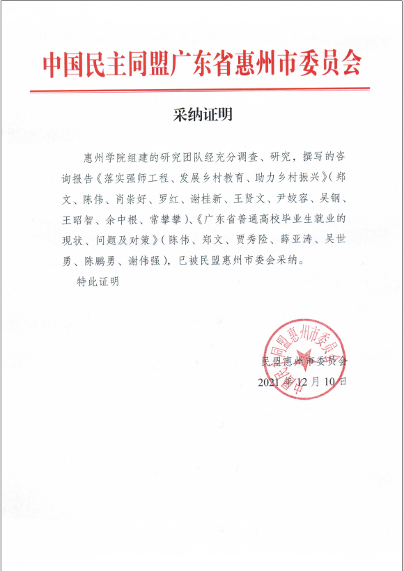 近日,由惠州学院民盟教育研究院主导、惠州学院组建的研究团队经充分调查、研究与撰写的咨询报告《落实强师工程、发展乡村教育、助力乡村振兴》(郑文、陈伟、肖崇好、罗红、谢桂新、王贤文、尹姣容、吴钢、王昭智、余中根、常攀攀)《广东省普通高校毕业生就业的现状、问题及对策》(陈伟、郑文、贾秀险、薛亚涛、吴世勇、陈鹏勇、谢伟强),已被民盟惠州市委会采纳。 文: 王贤文 审稿: 陈伟: 审核:陈伟