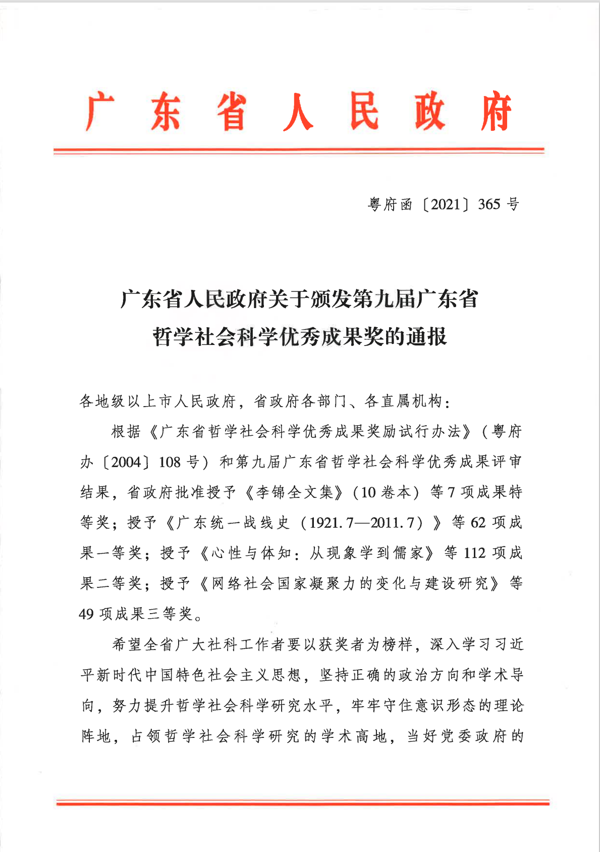 12月17日,广东省人民政府公布了《颁发第九届广东省哲学社会科学优秀成果奖的通报》文件,我校教育科学学院院长陈伟教授的研究成果《中国高等教育的历史方位:分析维度和变迁趋势》荣获广东省哲学社会科学优秀成果奖二等奖。据悉,该研究成果曾作为封面文章刊登于《高等教育研究》杂志,先后被《中国社会科学文摘》和《新华文摘》等两大权威性文摘杂志转载。文图:王贤文 审稿:陈伟 审核:陈伟