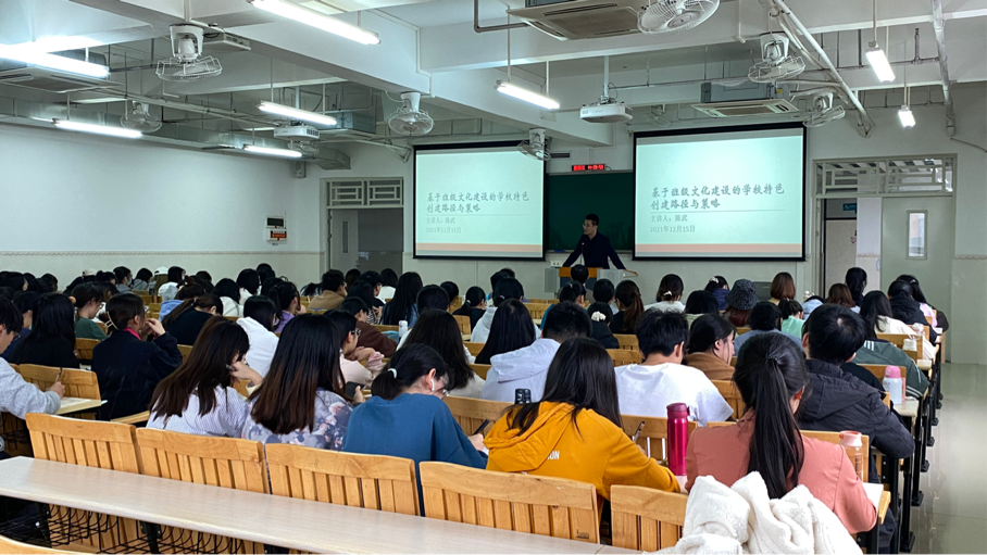 12月15日下午,宏益教育有限公司常务副总经理、华南师范大学附属学校总校长陈武受教育科学学院的邀请,在科技楼B座406为小学教育专业学生做《基于班级文化建设的学校特色创建路径与策略》的主题讲座。本次活动由教务处主办,教育科学学院承办。教育科学学院副院长谢桂新、学前教育系主任黄国庭以及20级小学教育专业学生参加了本次讲座。