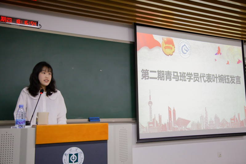 接着,第二期青马班学员代表叶婉钰同学发言。她先是对一直以来组织和筹办青马班培训的老师和工作人员表示感谢,同时也欢迎新一期学员的加入。经过一年的课程培训,她受益匪浅。最后她在学习生活和工作方面为同学们提出关于如何做一名优秀的青马班学员的建议。第三期青马班学员代表钟柔雅同学也上台进行了发言。她也从思想和行动方面提出自己对培训过程的一些期望,希望自己能与其他学员们一起在此次培训中有所收获。