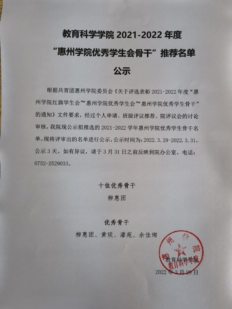 教育科学学院2021-2022年度“惠州学院优秀学生会骨干”推荐名单公示