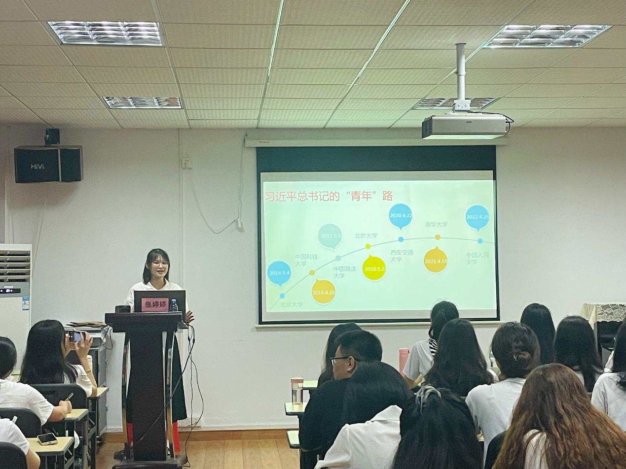 为了继续组织实施“青年马克思培养工程”,充分调动青马班各学员的积极性和向党性,为青马班学员们强基铸魂,我院特邀马克思主义学院理论宣讲团成员张婷婷于2022年5月14日在旭日楼614开展了第一次讲座,围绕《习近平与大学生朋友们》,讲述了五四期间习总书记于各大学的考察讲话。参与本次讲座的有青马班班主任杨婉琪及第三期青马班全体学员。