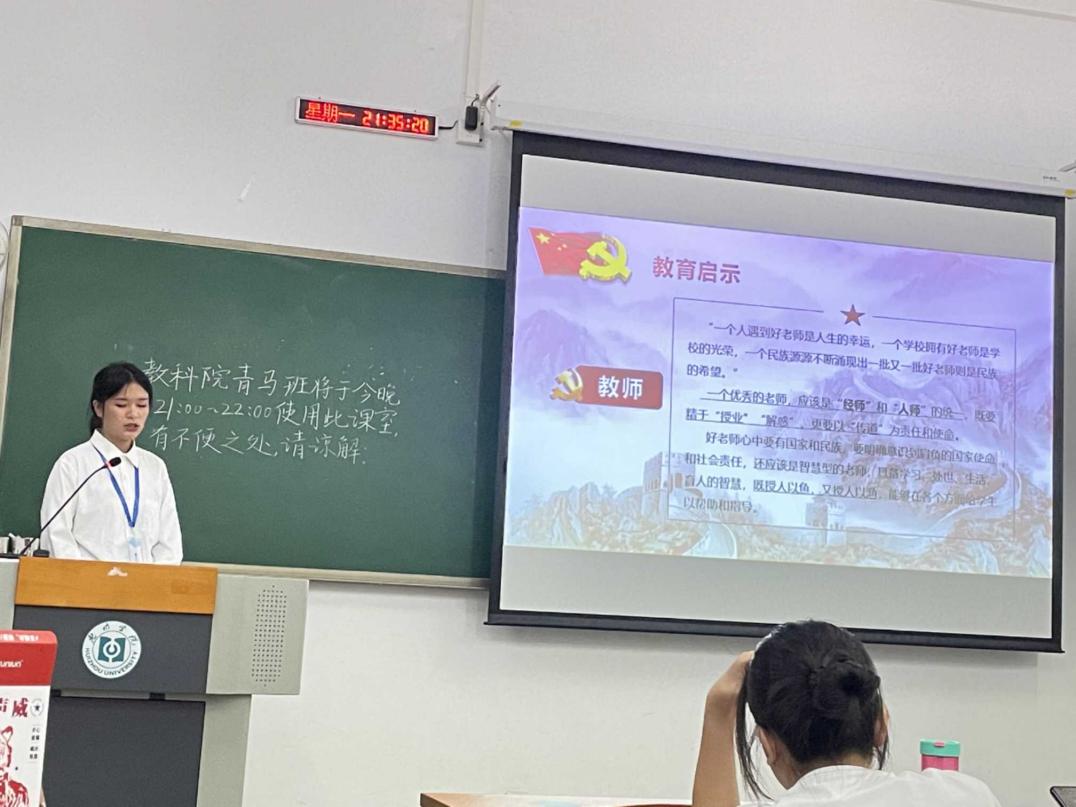曾婷围绕“新中国青年的责任和使命”这一主题联系到我们公费师范生自身,从为什么要学习马克思主义、怎样学习好马克思主义出发,深刻阐明了马克思主义的科学属性、理论品质、实践意义和时代价值,为我们在新时代学习和实践马克思主义提供了根本遵循。当代大学生需要培养和践行社会主义核心价值观,到基层中去、到实践中去、到人民中去,才能真正知道所学的知识如何去发挥、如何去为社会作贡献,做事敢创新勇奋斗,青年是国家的未来和民族的希望,希望同学们肩负时代责任,高扬理想风帆,要向我国老一辈杰出科学家学习,争取青出于蓝而胜于蓝。