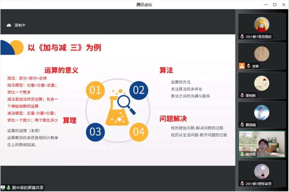 讲座伊始,脱中菲副校长提出“如何理解素养?”,从世界经合组织到2022版的义务教育数学课程标准一步步理解数学核心素养;同时,关于如何在课堂教学中落实核心素养的问题,提出“一体双翼三要素”的研究思路。接着,脱中菲副校长以《加与减》为例帮助同学们理解“深挖学生本质”,结合她的课堂教学经验,逻辑清晰地列出图表帮助学生理解运算意义,阐释如何处理好算理和算法的关系,并结合《买冰淇淋》的教学视频课例解释如何处理从解决生活中的问题到解决数学中的问题。然后,脱中菲副校长还提出“精准把握学情”,讲述自身调研了解学生的学习情况,并通过多个实例展现学生运算水平1到水平3的差异特征。最后,脱中菲副校长通过她的课堂实录,生动有趣地讲解了单元内容的结构化设计:厘清运算单元与学习主题的关系、确定单元中的关键内容和设计有效的情境和任务,阐释了导学系统的设计。在讲解单元结构化设计时,脱中菲副校长结合行动研究的教学案例,提出课堂教学要优化学习组织形式,设计课程的学习组织流程图,通过小组合作学习解决教学重难点。