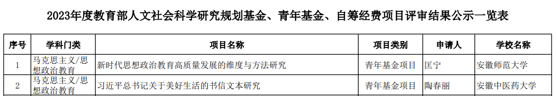 2023年9月15日,教育部社会科学司在官网发布了《教育部社科司关于2023年度教育部人文社会科学研究一般项目评审结果的公示》,公示了2023年度教育部人文社会科学研究一般项目评审结果。