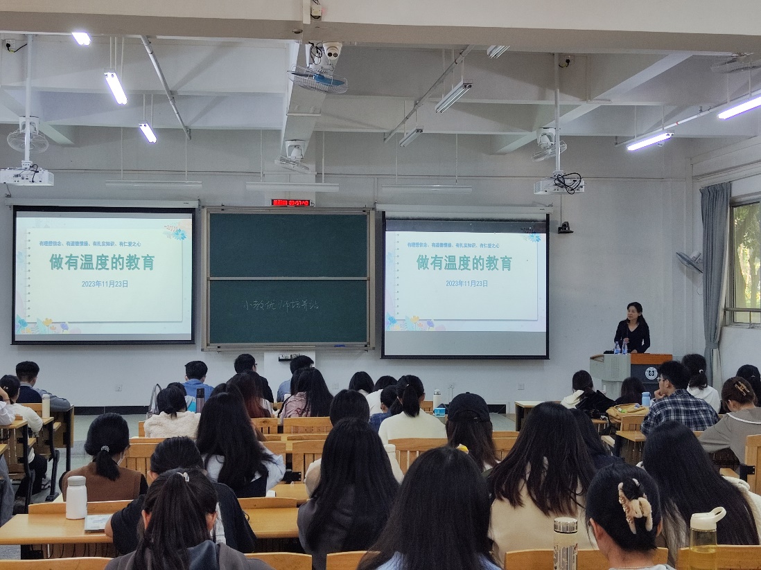 2023年11月23日上午,惠州市富民小学副校长袁卫平应邀在旭日楼118课室为教育科学学院21级小学教育专业全体同学作题为“做有温度的教育”的专题讲座。小学教育专业21级全体同学参加讲座。讲座由小学教育系主任金艳主持。