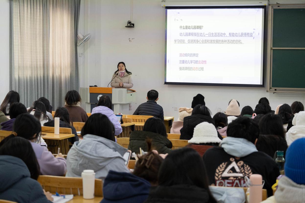 在课程案例分享部分,李园长借助幼儿园中“童趣野炊”的案例,带领同学们展开思考,提出我们要“回到儿童身边,发现儿童视角”。教师应从回归、察觉、体悟和行动四个角度入手,努力做到想儿童所是,见儿童所见,知儿童所思,做儿童所愿。在组织课程活动时,应遵循产生兴趣、初步体验、深度研究、回顾分享、引发思考的五步流程。在另一案例“‘石’在有趣”中,李延君园长则强调教师要明确课程中的三维目标,注重孩子的协调发展,并进行多元融合,开展综合性活动。同学们通过李园长的分享,更为直观体悟到了园所课程探索与实践的意义,纷纷表示受益匪浅。