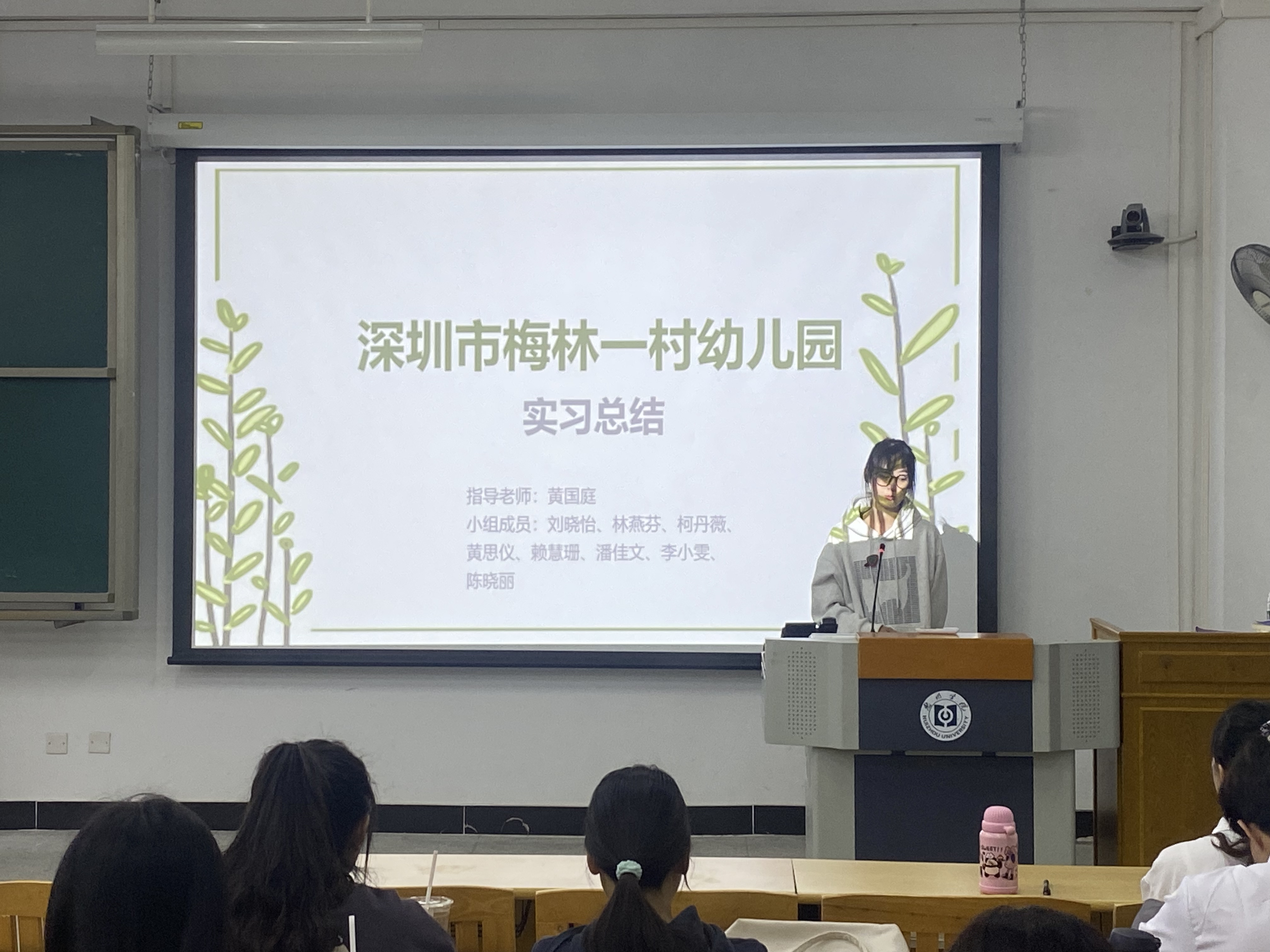 大会第二部分,由各个园所的实习生们进行汇报。首先由梅林一村幼儿园的实习生进行实习分享。该园的实习生们介绍了幼儿园的全环境支持系统课程特色节日“爸爸温暖周”,也分享了他们的实习感想。随后,深圳幼儿园的实习生进行实习分享,介绍了深圳幼儿园的环境布置和特色以及幼儿园的班级主题活动,幼儿园开展的特色活动。莲花二村幼儿园实习生分享了该园以自然和中国风为特色的实习环境,以及颇具特色的幼儿娱乐设施。同学们还介绍了在该园实习基本情况,包括实习期间园本课程、一日生活流程的培训,也分享了该园的课程理念幼儿园特色活动。接着由深圳技术大学附属幼儿园的实习生进行分享。该园的特色节日活动也非常丰富,该组同学们还为大家介绍了复盘会建构思维模式的方法。深圳市蓓蕾幼儿园的实习小组介绍了该园的特色无边界游戏无边界课程。惠州学院附属幼儿园的实习生们同样为同学们介绍工作内容成果,并分享了实习感受。龙岗区龙城街道中心幼儿园的实习生们介绍园所文化及环境,同时分享了他们的诱导桌创设过程最后深圳市龙岗区吉华街道三联第一幼儿园的实习生们介绍了园所的班级环境特别活动。