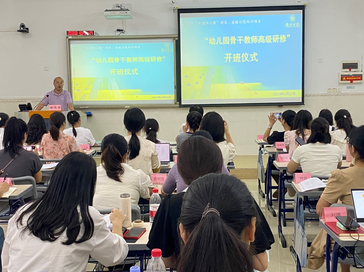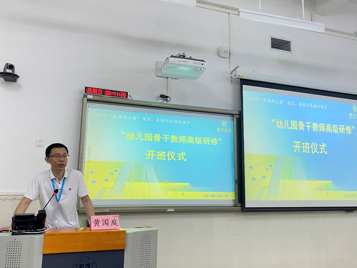 2024年6月23日上午,广东省2024年新强师工程中小学幼儿园教师、校(园)长省级示范项目之幼儿园骨干教师高级研修(惠州学院班)在旭日科技大楼B座202举行开班典礼。该高级研修班由royal皇家88平台承办,该学院党委书记谢伟强、学前教育系黄国庭主任以及来自全省各地市的50位幼儿园骨干教师参加了开班仪式。仪式由教育科学学院教师麦日岸主持。