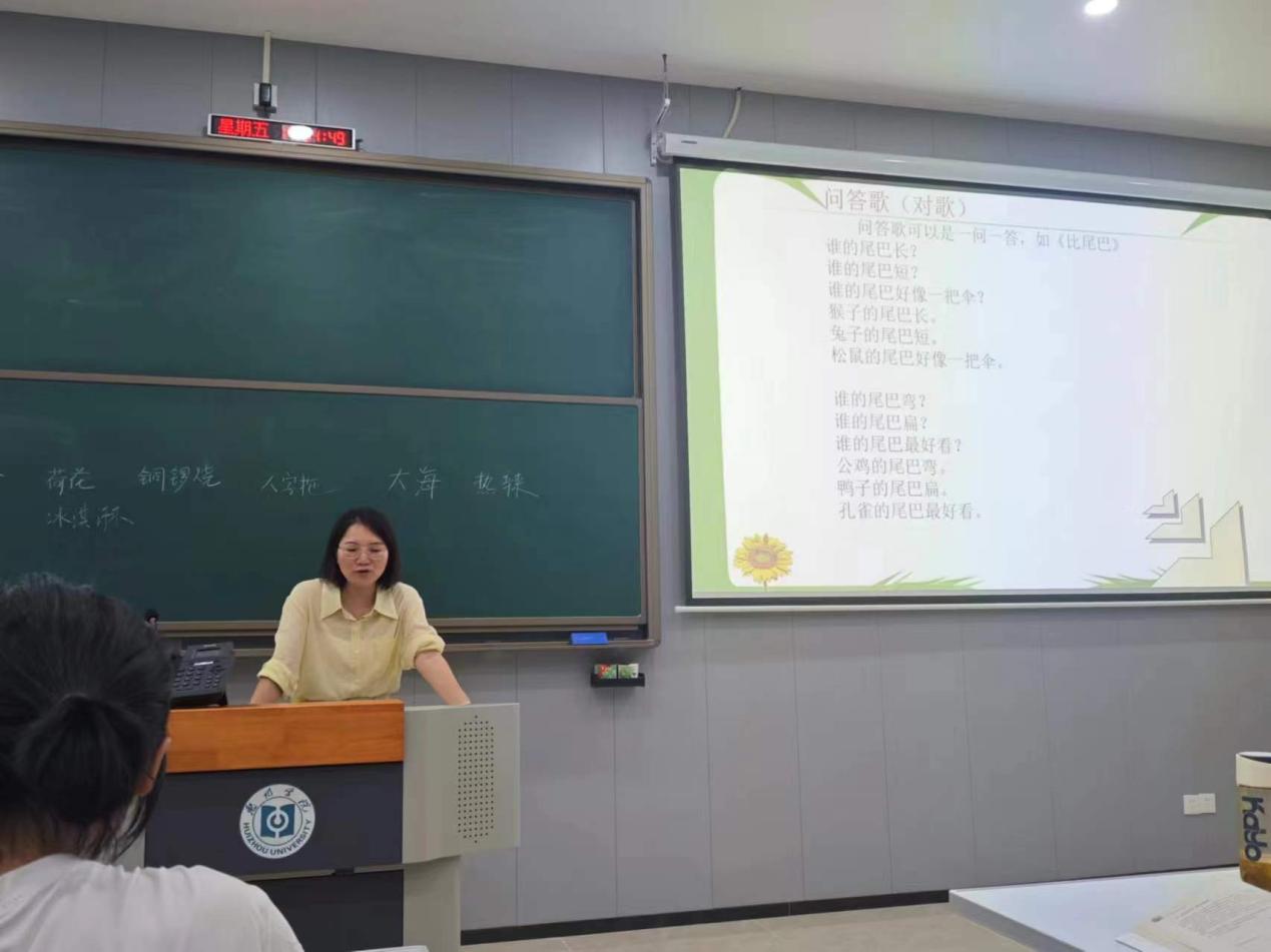 随后,曾老师向同学们分享如何巧用儿歌助力幼儿一日生活。她提出,儿歌对幼儿的学习、情感交流、传承文化等方面都具有积极作用,教师应将其应用到日常生活和教学中。曾燕老师结合自身教学实践向同学们分享了儿歌在幼儿园一日生活中的应用:在去教材化的时代,一首朗朗上口,简单易懂的儿歌往往可以让老师们的教学更加轻松;贯穿在儿童一日生活中的儿歌,能够在潜移默化中为孩子们培养良好的生活习惯,更加适应幼儿园的生活;而问答歌的形式,可以帮助孩子们更好地学习知识,认识世界,甚至还可以让点名变得有趣。同时,对于不同年龄阶段的孩子,教师们应当选择适合的儿歌,或对儿歌进行改编以适应教学需求。