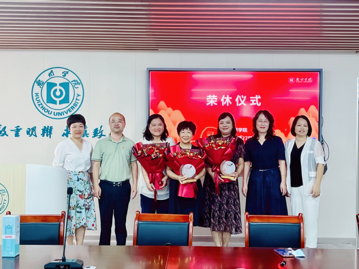 活动现场,谢桂新副院长为饶淑园、罗红老师赠送“光荣退休”摆件,学生代表为三位老师敬献鲜花。