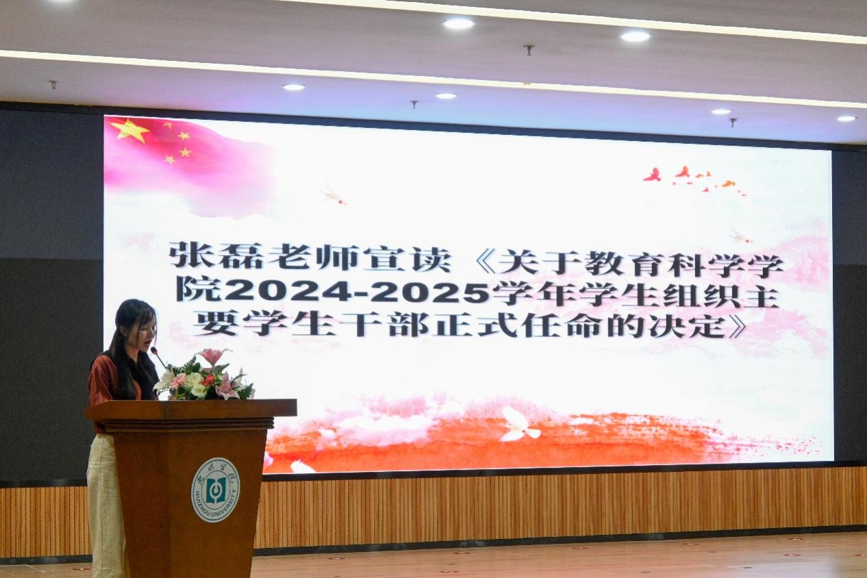 随后,辅导员张磊宣读了《关于教育科学学院2024-2025学年学生组织主要学生干部正式任命的决定》文件,党委副书记钟小川,辅导员袁玉龙为新一届学生组织干部颁发聘书。该项议程任命了包括团委第二副书记,学生会主席,各部门部长、主任等学生组织重要干部。