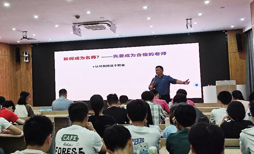 讲座伊始,曾校长请全体同学起立朗读袁枚的诗词《苔》,而后抛出问题“有谁是自愿想当老师的?”并坦言教师行业并非如憧憬般美好,挫折恰恰是教师职业意义的来源,教师的幸福感源于见证学生的成长,并以仲恺区教师招聘数据为例,让学生认知行业的竞争压力。接着,曾校长分享了自身职业选择的经历,并围绕“什么是老师”,引用《师说》中的“传道授业解惑”,结合习近平总书记的“四有好老师”要求,强调“立德树人”需将“德”置于首位,论及“好老师”标准,则以“是否愿将孩子交给这位老师”作了通俗诠释。