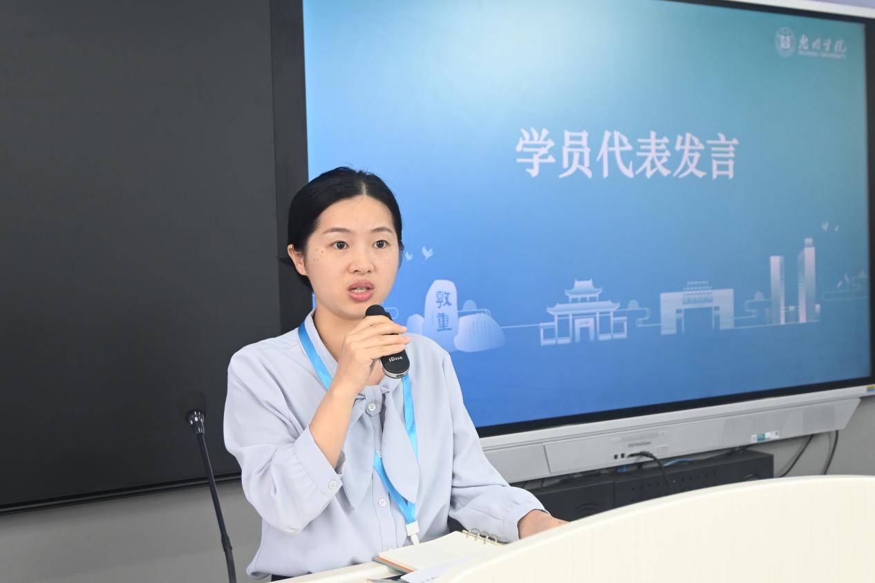 紧接着,深圳市龙华区行知小学附属丰润幼儿园的陈柏竹老师作为班长,代表全体学员发言并郑重承诺:全体学员将珍惜机遇,以空杯心态投入学习,严守培训纪律,在专家引领下互启共进,“以师德为根,以师风为帆”,展现新时代幼师风采。继续教育学院副院长邓伟浩随后发表讲话,进一步强调了师德建设对学前教育高质量发展的战略意义。
